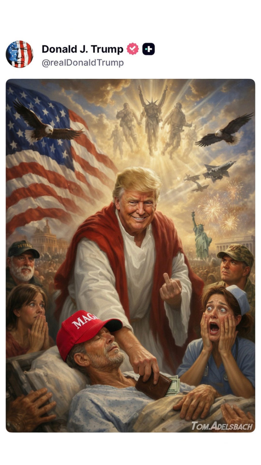 There’s a lot of disturbing stuff even in the original image Trump posted. What kind of “angelic” figures are those in the sky? What of the bizarre fighter jet? What’s that building in the background on the left?