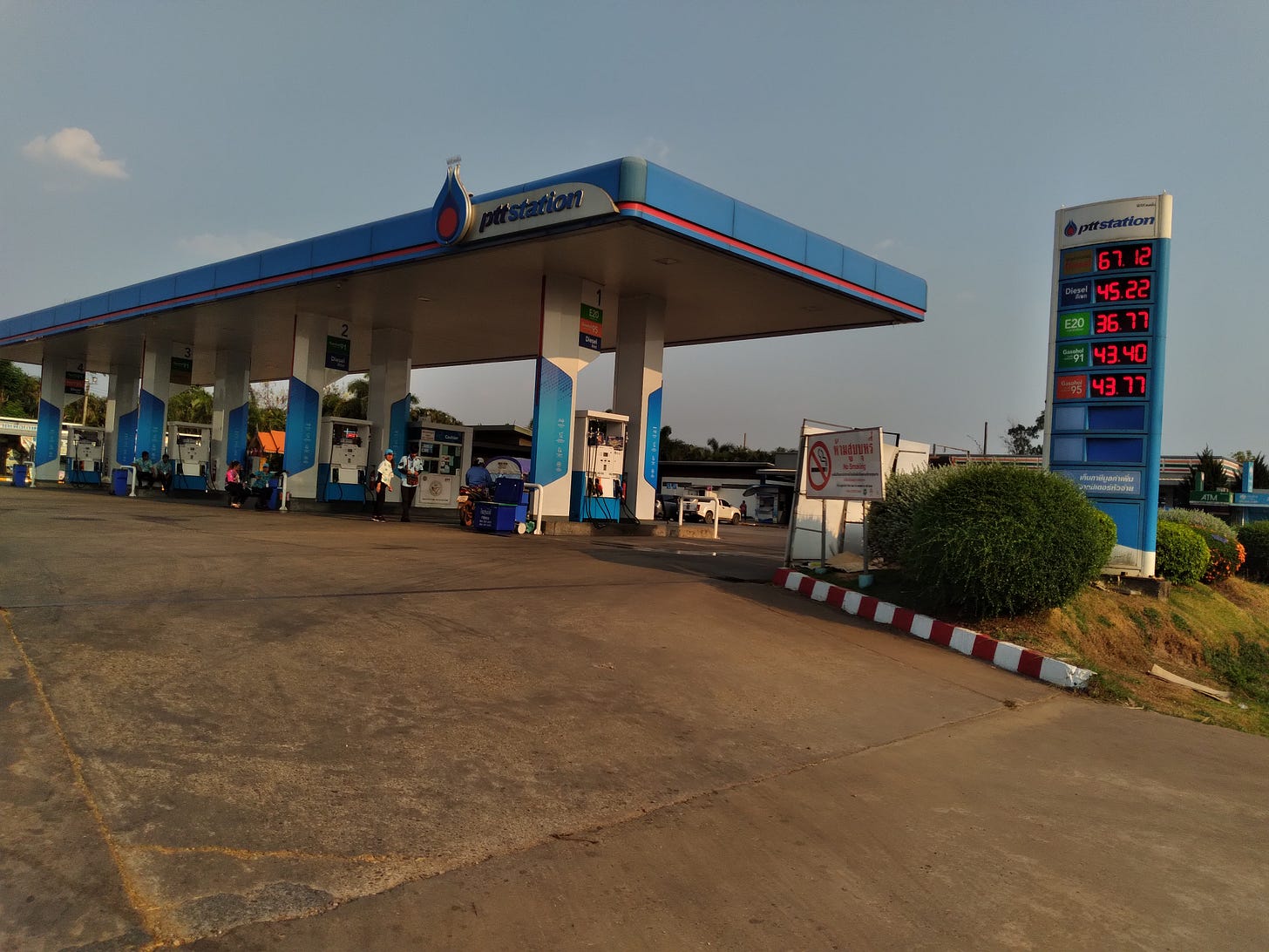 This picture was taken of a nearby service station in Nakhon Phanom, Thailand, on April 13, 2026. There is no panic here: despite being the morning of Songkran, the biggest holiday of the year in Thailand, there is no line for fuel. The price in litres per baht to dollars/gallon normalizes to $5.04 for 91 octane, ethanol at $4.35 and diesel at $5.48.