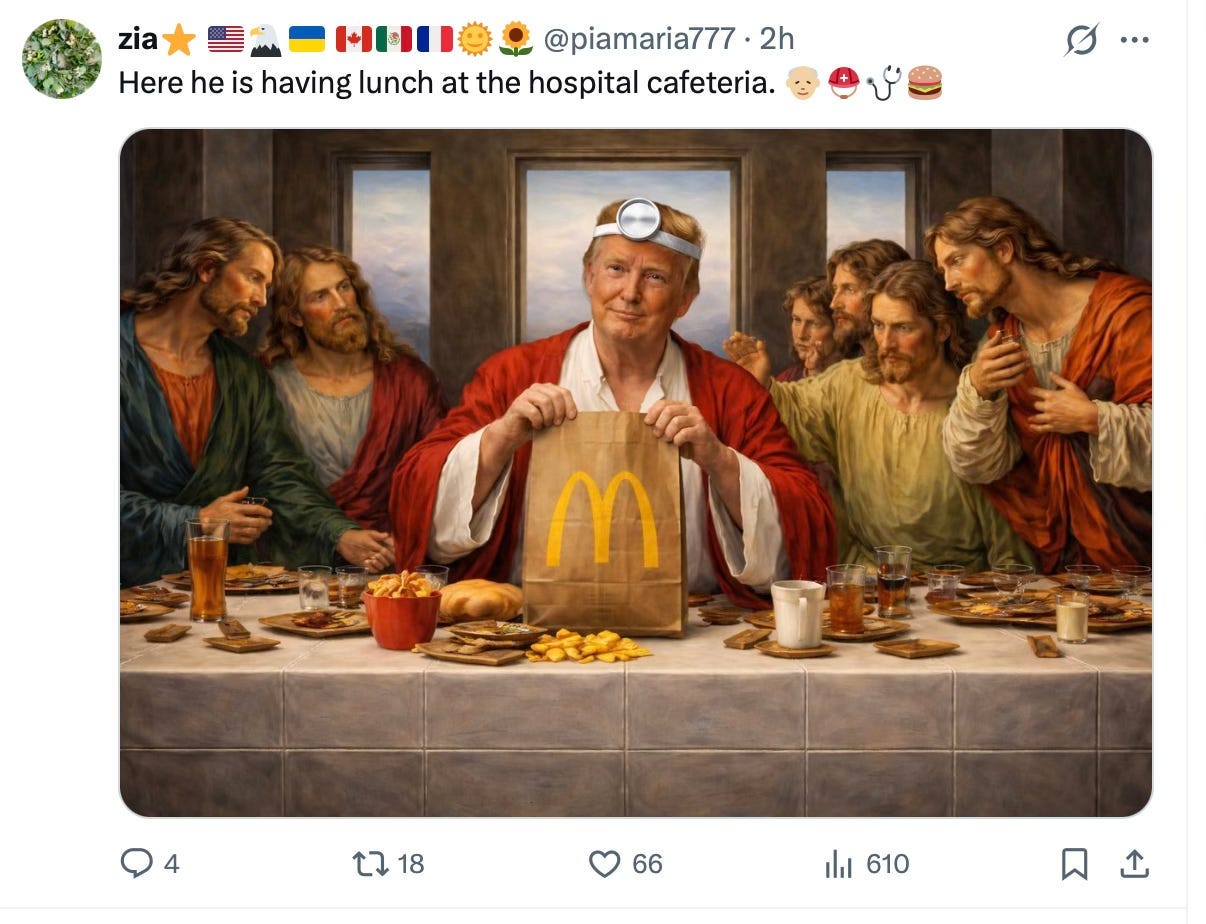 The memelords had a field day with this. I mean the patient in the original picture that Trump is healing in some doctorly way even looks like Jeffrey Epstein. I find this one with him winking disturbing. It’s all a show.